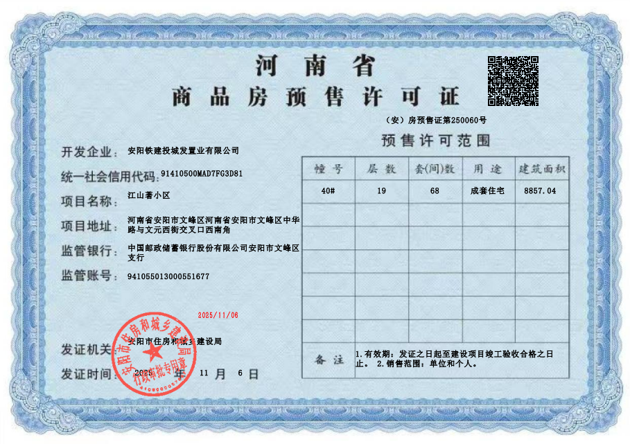 11月6日,鐵建投城發·江山著項目40#樓取得《商品房預售許可證》。截至目前,項目一期所有樓棟已全部達到預售標準,為后續開發建設奠定堅實基礎。