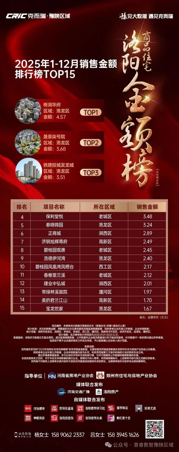 近日,克爾瑞正式發布洛陽市2025年1-12月商品住宅銷售榜單。在競爭激烈的市場環境中,鐵建投城發·龍城項目憑借卓越的產品力、穩健的市場表現與良好的客戶口碑,榮登洛陽市商品房銷售金額TOP3!